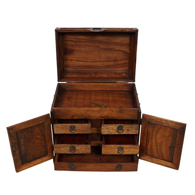 All are purposefully ornamented to give the exterior an elegant appearance. Antique Shanghai China Cherry Wood Jewelry Box with Brass Hardware Accents and Three Jade Inlays on Lid, Antique Chinese Jewelry Box. Plenty of room for extensive jewelry collection!