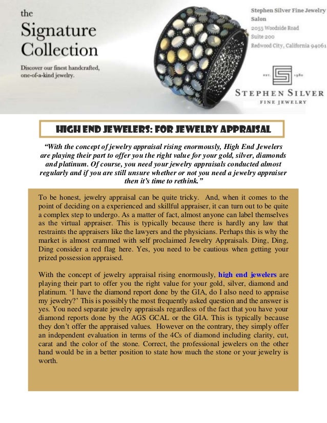 Appraisal For Jewelry. A jewelry appraisal is the process in which a certified professional examines and states a monetary value for a piece of jewelry or collection, typically resulting in a document that outlines the object's attributes and assigned value. A jewelry appraisal is also mainly needed for you to be fully aware of the exact value of your jewelries.