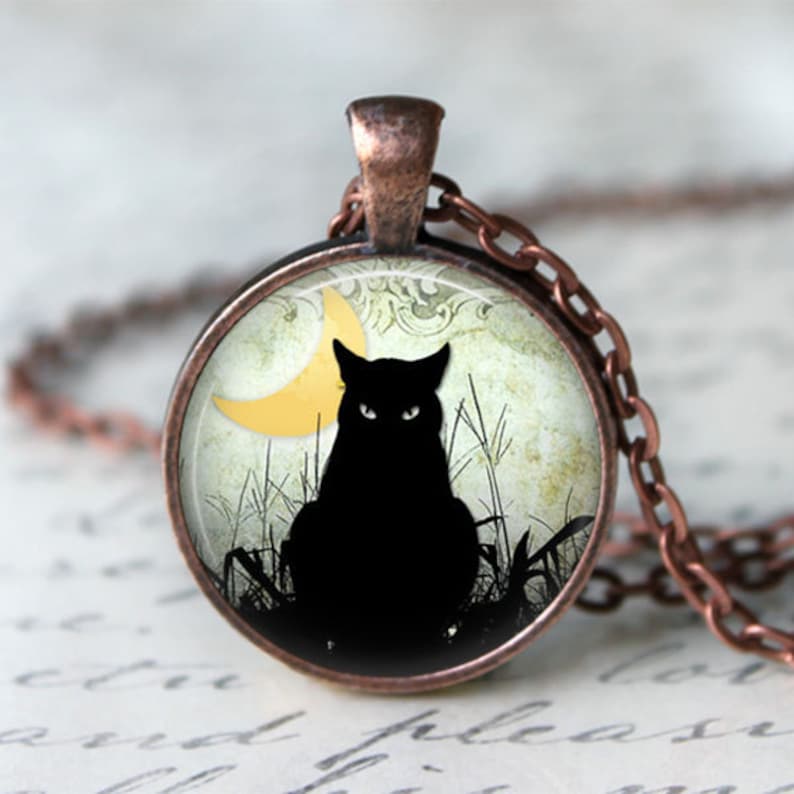 Black Cat Necklace Crescent Moon Cat Jewelry Halloween | Etsy