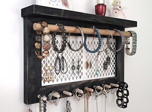 Costway Wall Mounted Jewelry Organizer Vintage Wood Jewelry Holder Hanger R. Finished in black, this cool jewelry holder is perfect for displaying your favorite pieces of jewelry in style. This compact model has double doors that hinge open to expose ring, bracelet, and jewelry slots, as well as a small grate.