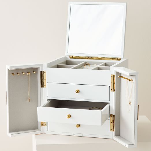 Modern Jewelry Box. Featuring a high gloss wood pivoting design with a magnetic closure and three levels of storage boxes, this jewelry box is a great choice for you. The base of Trigem doubles as a jewelry holder for added accessory storage.