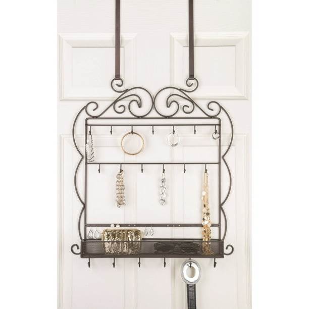 Over The Door Jewelry Organizer Decorative Mirror ... (Mayme Cole) Great for your whole collection of earrings, necklaces, bracelets, watches and rings. The versatile jewelry hanger has a variety of hooks for hanging earrings, bracelets, necklaces and much more! Perfect for Over the Door Cabinet for Space Saver or Mounted to the Wall.