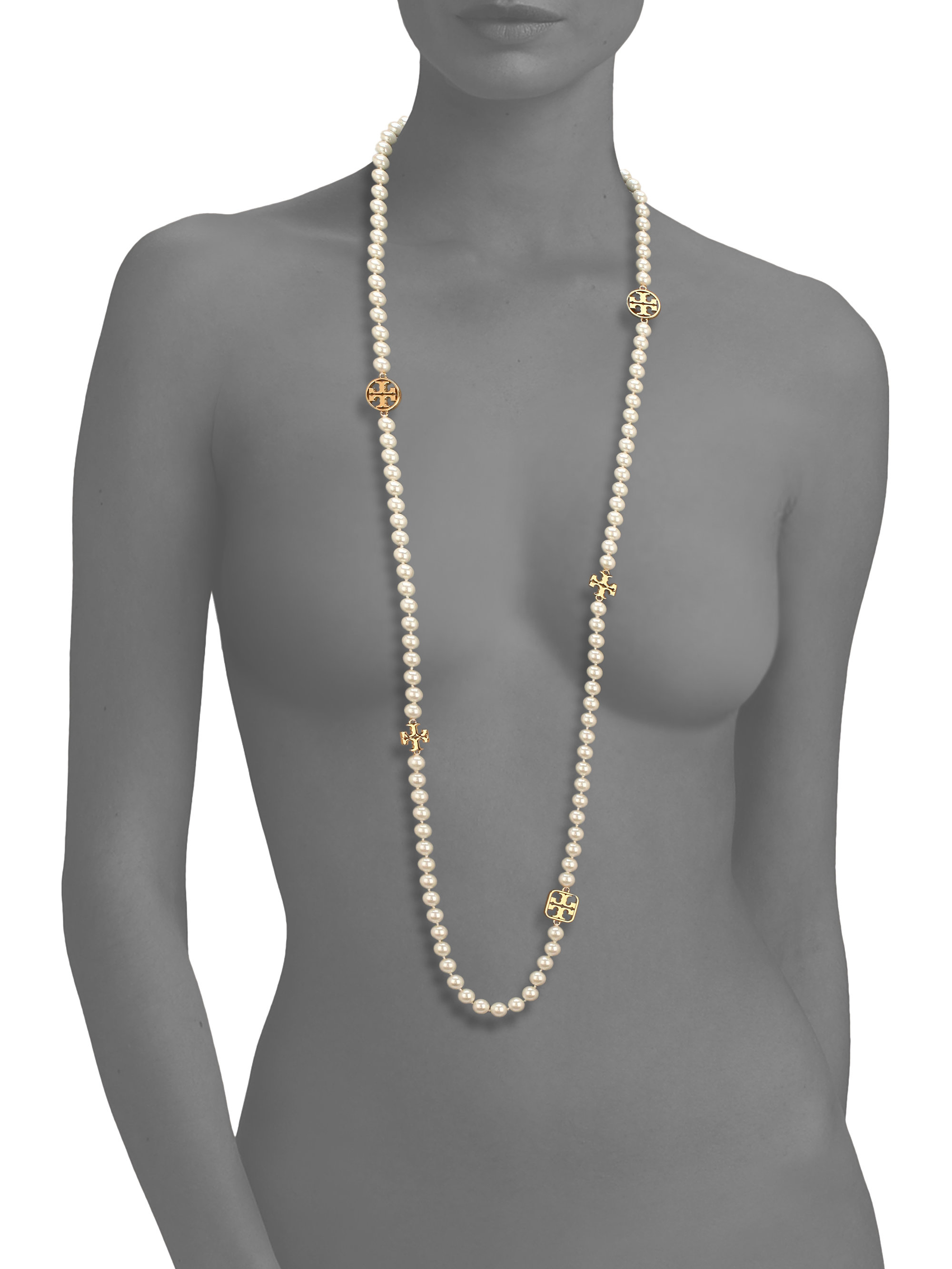 Tory Burch Evie Logo Faux Pearl Station Necklace in ...
