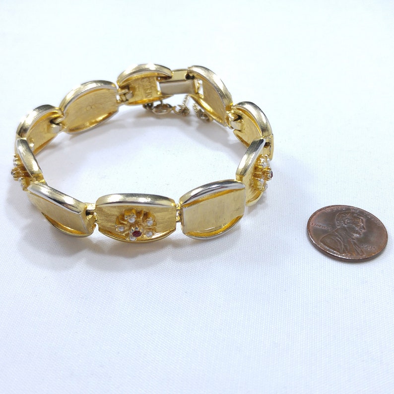 Vintage Jewelry Bsk. Description: BSK My Fair Lady Flower Basket Bracelet - Much harder to find than the brooches, this bracelet features enameled florals in peach, coral and cream with green enameled leaves and clear rhinestone accents. The jewelry has some interesting and original designs with gold plating, seed pearls and rhinestones.