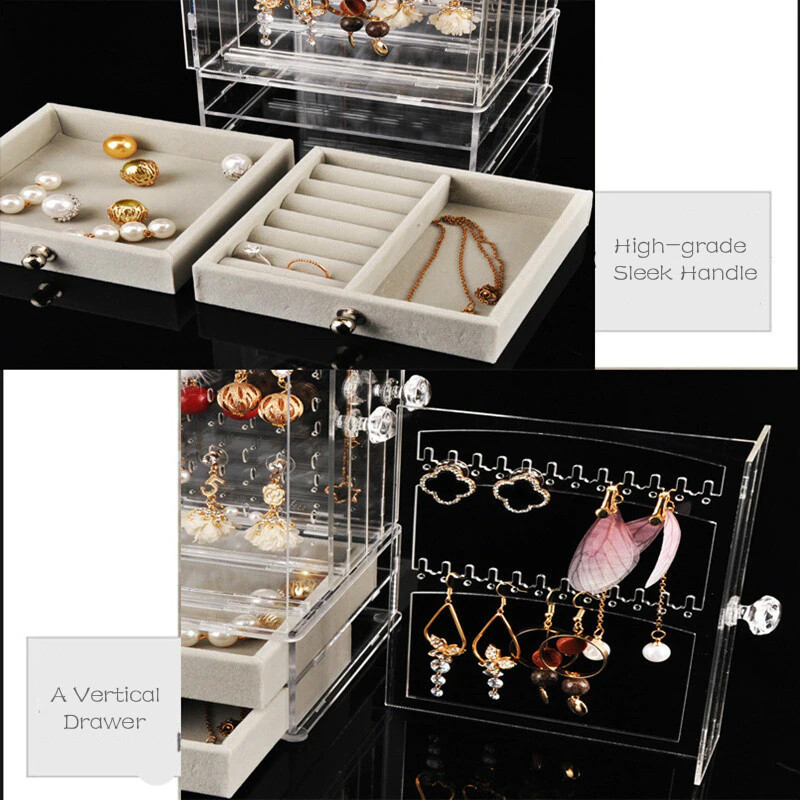 Acrylic Jewelry Storage View All Jewelry Storage Clear Filters. We love this acrylic four-tier jewelry box because it keeps jewelry safe and protected while still showcasing items displayed in the top tray. Each piece is a great addition to bathroom counter tops, dressers and even cosmetic vanities.